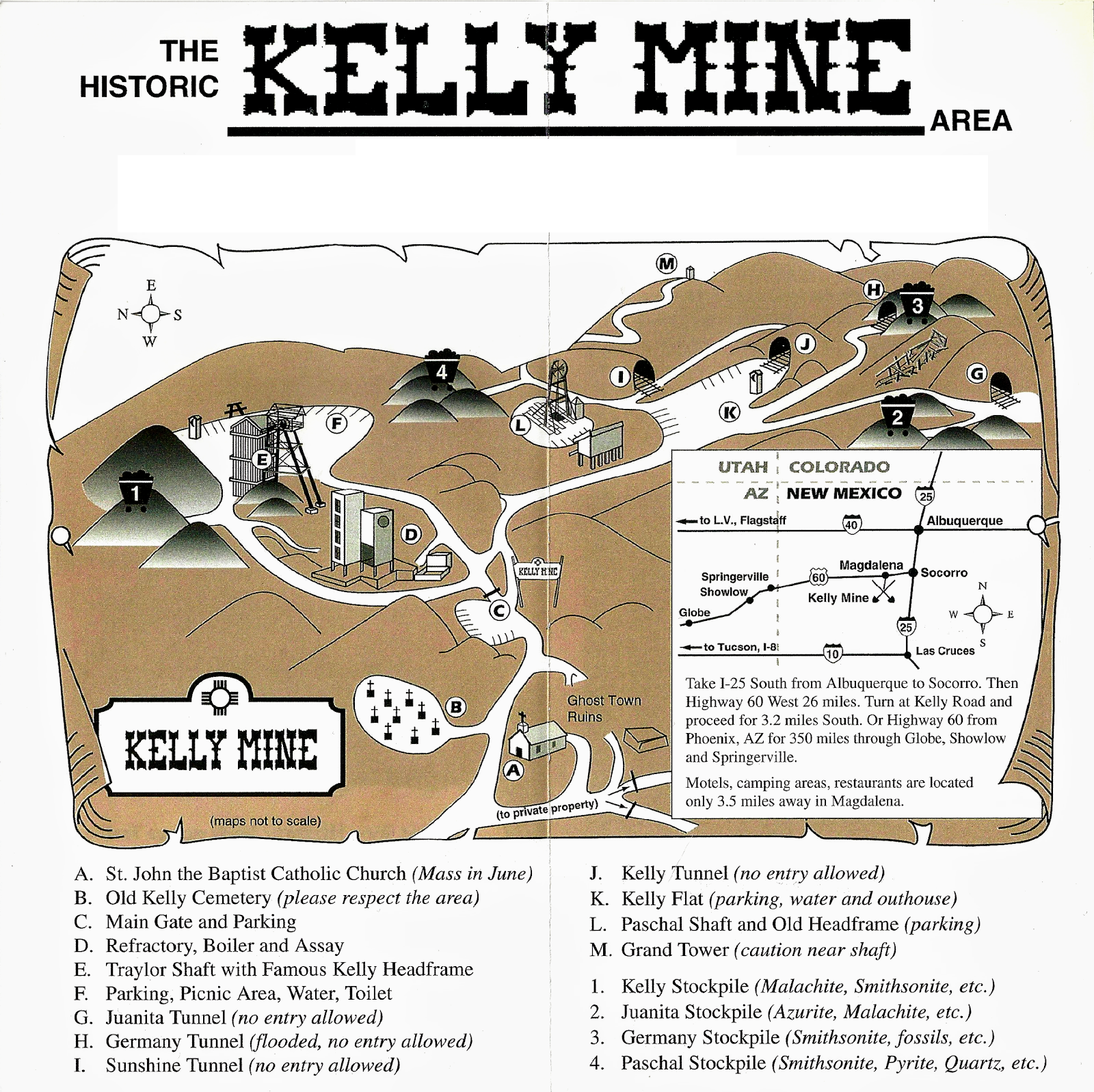 The Kelly Mine near Magdalena in New Mexico USA is perhaps the premier historic mining site in the state. It is also the site of a "boom-town" that sprang up at the end of the 19th century called Kelly New Mexico hosting a population of over 3,000 souls. The hundreds of acres of the Kelly Mine have remained in private ownership and have been open to paid public visits under strict safety and time conditions. The owners of the Kelly Mine wish to express their sincere gratitude to all who have come to this place to enjoy the stunning views and to pick on the tailings piles for Smithsonite and over 30 other minerals. However, after all these wonderful years, the Kelly Mine will be CLOSED to all visitors, effective April 9th 2025 until further notice. Please check this website for updates and news , or to contact the owners. We will be monitoring the property for any trespassing or disregard for this closure. We hope that you will respect this historic Mine and stay away while the owners carry out repairs, upgrades and other improvements on their property. Any tickets or passes that are sold after midnight on April 8th are void and cancelled. Or upgrades to the Kelly will be substantial and lengthy but are way overdue, and so we look forward to seeing you once this beautiful site is opened again. Thanks for your patience and support, and please respect this historic landmark as we work slowly and surely to it's reopening... Together . Thank you.